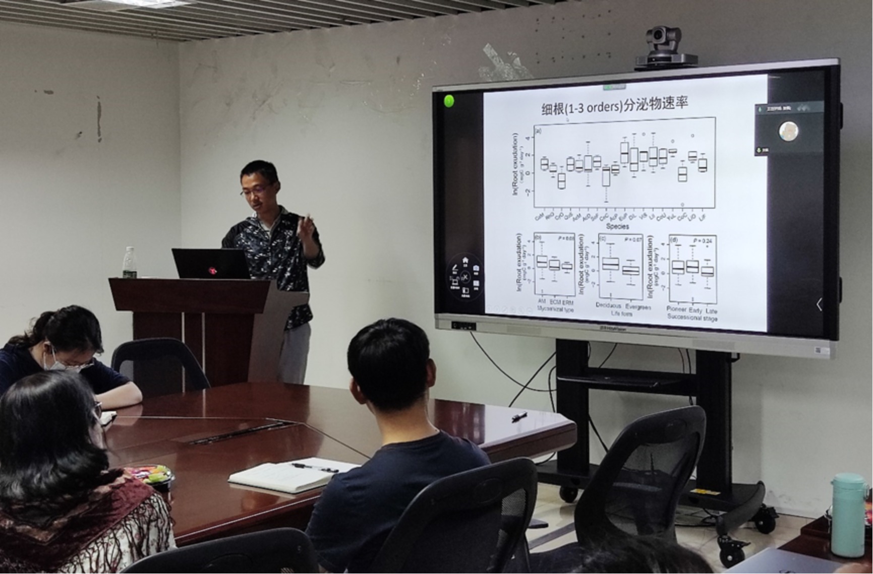 朱彪研究员以植物根系及其性状的关系为引,主要讲解了他与他的研究团队所做的工作。报告从介绍植物根系的不同性状开始,通过对中国各地不同物种的根系进行实验和研究对比后,研究得出了根系呼吸速率与其他性状的关系、根系分泌物速率与其他性状的关系、吸收根和运输根性状与根际激发效应以及根系功能性状与根际效应的种间关系。研究表明,仅对木本植物来说根系呼吸与氮含量-组织密度轴关系更紧密且无显著的谱系信号;根系分泌物是一个竞争性性状,和高效率的形态属性可能是互补的植物养分获取策略;根际激发效应与吸收跟碳分配间存在显著的正相关关系,但与运输根的性状关系较弱;木本植物的根际效应与竞争性的根系性状之间的氮含量呈正相关。