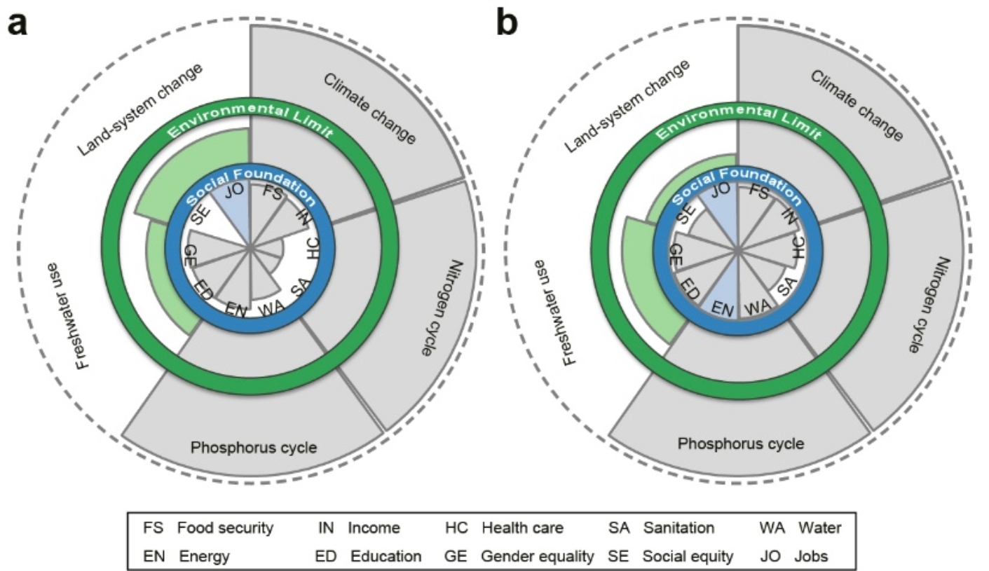 图3 2000-2018年世界(a)和中国(b)相对于安全且公正运行空间的表现。注:当内部楔形达到社会基准(人类福祉),外部楔形物处于环境足迹阈值/限额内时,国家或地区被认为处于安全且公正的运行空间。社会基础内环楔形表示相对于社会基准的实际人类福祉指标;外环楔形表示相对于环境界限的实际环境足迹。环境足迹阈值/限额用绿色环表示,社会基础用蓝色环表示;楔形测量每个维度指标与其边界(阈值/限额)相比的百分比(楔形中心数值为0%,边界数值为100%)。