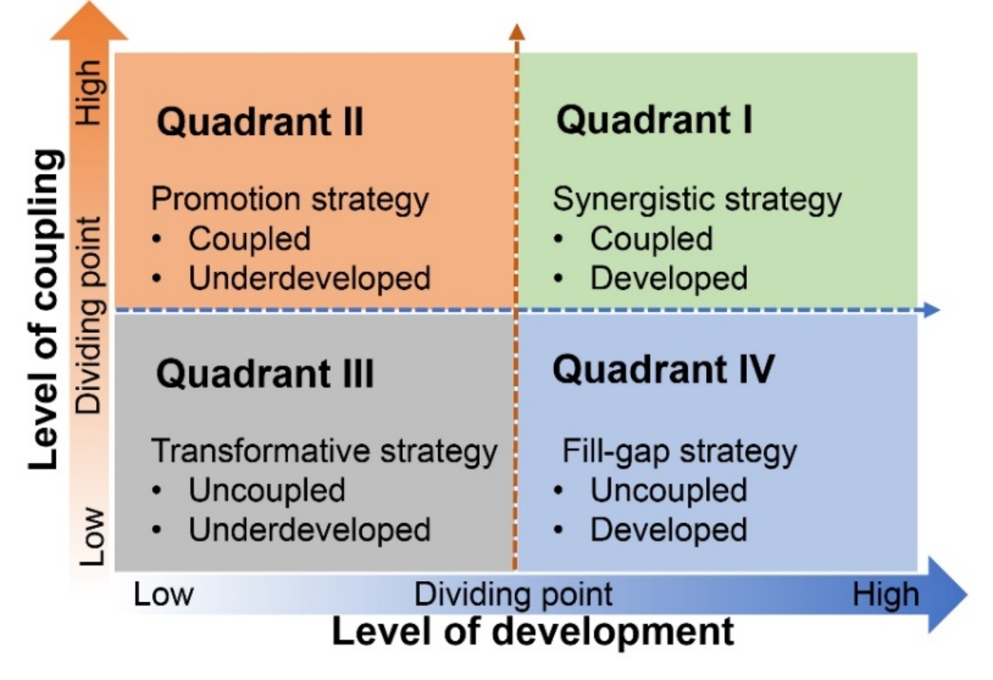 根据环境绩效和人类福祉耦合协调度的大小和趋势度将区域可持续发展水平分为四种发展模式,对应四个象限:象限I.环境与人类福祉协调耦合且变化趋势显著向好、象限II.环境与人类福祉协调耦合但变化趋势不显著、象限III.环境与人类福祉非协调耦合且变化趋势不显著、象限Ⅳ.环境与人类福祉非协调耦合但变化趋势显著向好。