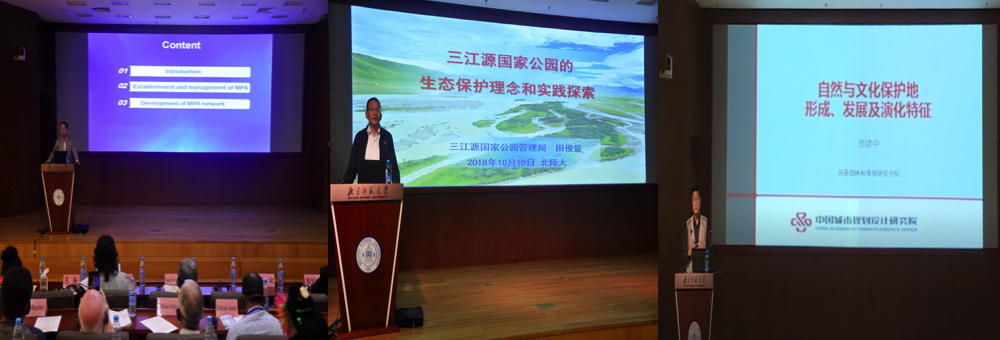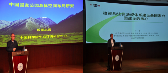 傅伯杰院士在题为《Eco-Civilization: China’s Ecosystem Restoration and Management》的主旨演讲中指出,中国在生态系统保护和恢复方面做出了巨大努力并获得初步成效,包括中国生态系统研究网络(CERN)的完善和生态系统恢复计划的进步等方面,但与此同时中国也正面临着各种新的生态挑战。Yukio教授在题为《National Parks and Geoparks in IGU Perspective》的主旨演讲中,为大家介绍了许多国家公园和地质遗迹的案例,其中包括日本的三陆地质公园、汶川地震遗迹等,并讲述了国际地理联合会在国家公园和地质公园的建设和发展领域所做的工作。欧阳志云主任在题为《我国国家公园空间布局研究》的主旨演讲中,向大家阐述了我国国家公园空间布局研究的目标与任务,讲解了保护地分类体系并分享了国家公园规划国际经验,介绍了我国自然保护地体系与国家公园定位,以及国家公园体系总体布局等内容。何平所长在题为《政策和法律法规体系建设是国家公园建设的核心》的主旨演讲中,向大家介绍了中国自然保护现状,并以三江源为例介绍了实际工作中的难题和解决措施,最后对国家公园相关政策和法律法规体系的建设提出了建议。