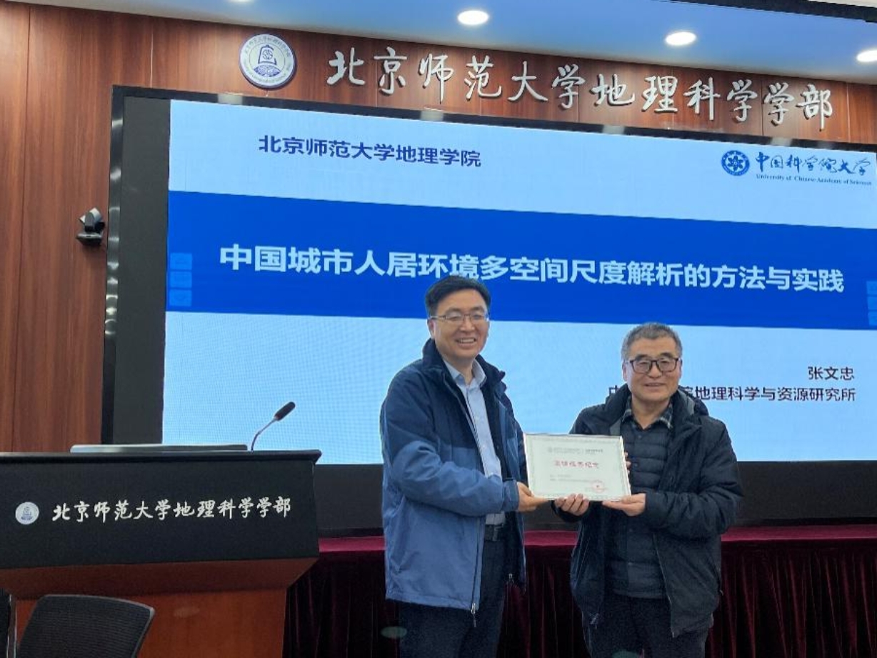 报告会开始,地理学院院长张科利教授代表全院师生表达了对张文忠研究员的欢迎与感谢,并为张文忠研究员颁发了特邀报告纪念。随后宋金平教授现场介绍了张文忠研究员的学术贡献和社会影响。