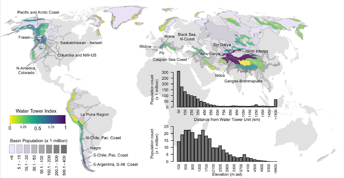图1 水塔指数(WTI)、水塔单元及其下游流域的人口。图上标明了洲际尺度五个水塔指数最高的水塔。柱状图显示了生活在水塔单元内的人口和海拔以及和水塔单元距离的关系。