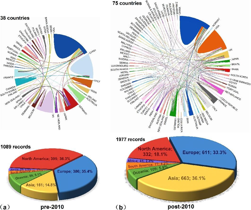 图10 2010年前 (a) 和2010年后 (b) 国际合作网络以及每个大陆发表的SIRSD研究的数量及占比