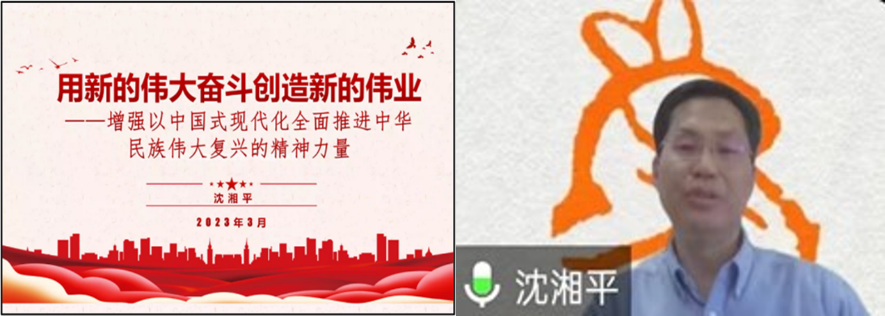 沈湘平老师围绕“增强以中国式现代化全面推进中华民族伟大复兴的精神力量”这一主题,从三个方面展开论述。首先沈老师由韦伯命题引出中国式现代化,阐明了中国式现代化内涵、特征、要求及其何以可能成功。立足中国、放眼世界,深刻阐述了什么样的现代化是好的现代化,并指出党的二十大报告正是关于现代化精神动力的纲领性宣言。其次,沈老师提出了不论是中国人民“富起来”后的必然要求,还是完成伟大使命的根本保障,抑或是中国式现代化的本质规定等多方面、多维度、多领域的问题,都昭示着新时代新征程迫切需要增强精神力量。最后,沈老师指出:新时代新征程增强的精神力量中,思想武装是前提,党内是关键,全社会是基础,全党全国各族人民自信自强、团结奋斗最紧要。在以中国式现代化全面推进中华民族伟大复兴的新征程上,我们要自觉以习近平新时代中国特色社会主义思想为武装,从自身做起,弘扬伟大建党精神和历史主动精神、斗争精神、担当精神、实干精神;弘扬劳动精神、奋斗精神、奉献精神、创造精神、勤俭节约精神,为全面建设社会主义现代化国家、全面推进中华民族伟大复兴贡献力量!