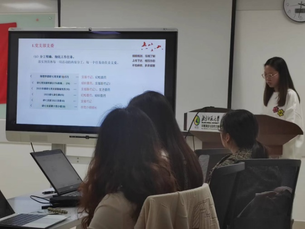 接着,两个优秀党支部进行经验分享,两位分享者从支部概况、党日活动开展、党员积极性调动、支部日常管理等方面展开,为其他支部提供了一些问题的解决方案,如学时记录,资料整理及留存,签到和请假制度的落实,供各个支部进行学习和参考。