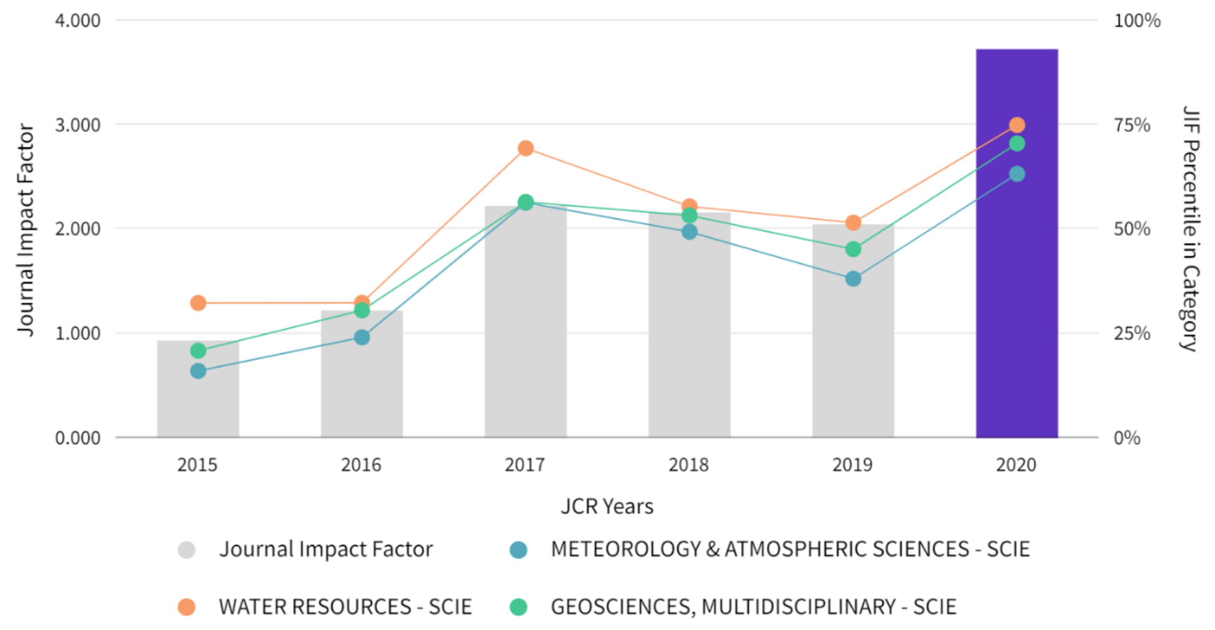 2021年6月30日,科睿唯安发布了2020年度最新《期刊引证报告》(Journal Citation Reports)。报告显示《国际灾害风险科学学报》(International Journal of Disaster Risk Science,IJDRS) 2020影响因子为3.727,5年影响因子达4.67。在地球科学、多学科(GeoScience, Multidisciplinary)、气象&大气科学(Meteorology & Atmospheric Sciences)、水资源(Water Resources)三个学科类目均位列Q2区。