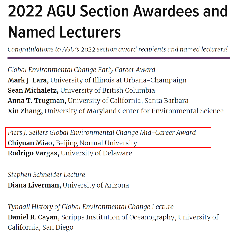 9月7日,美国地球物理学会(AGU)官方网站发布了2022年度“Piers J. Sellers全球环境变化职业中期奖(Piers J. Sellers Global Environmental Change Mid-Career Award)”获奖名单。学部缪驰远教授,因在气候变化与流域水文过程研究中的突出贡献,获此殊荣。