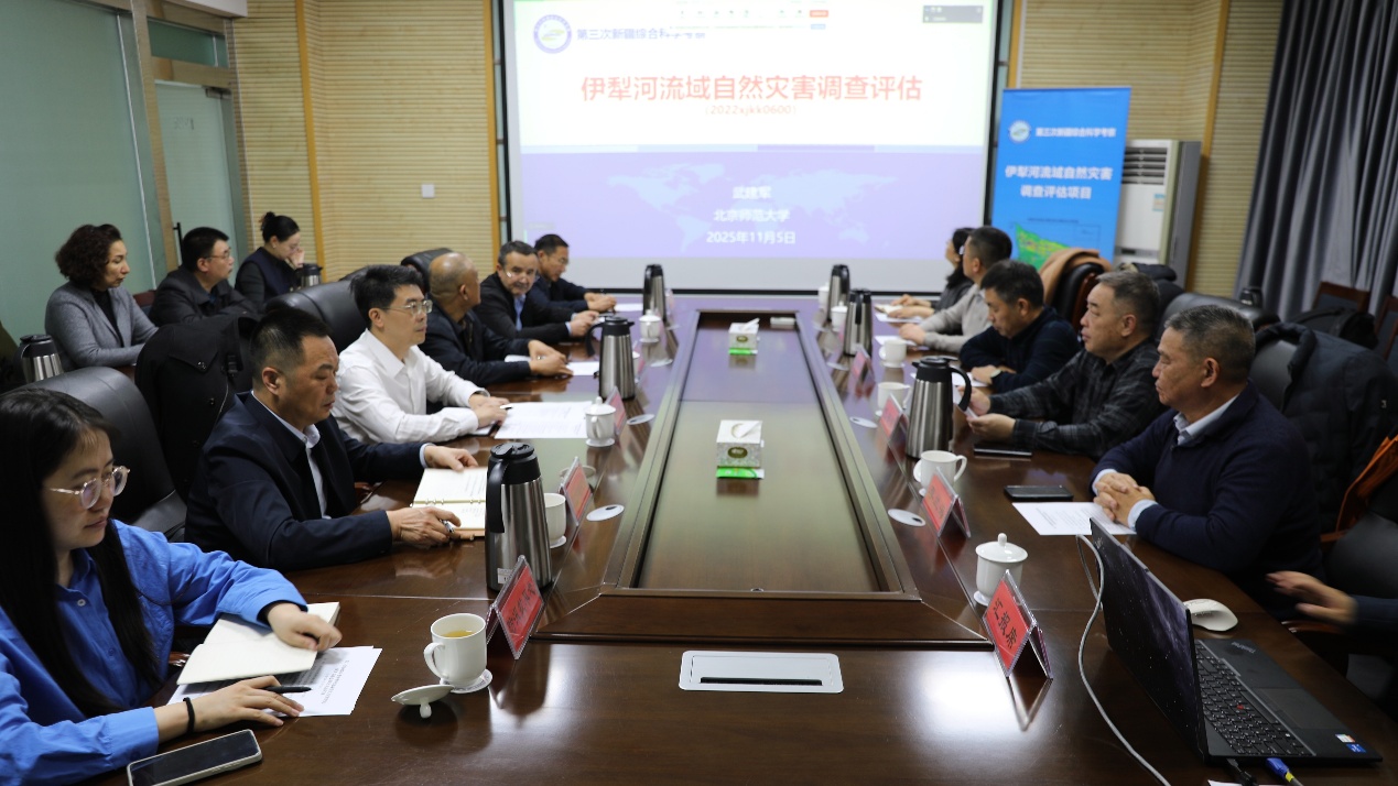 项目首席武建军教授介绍了项目研究进展及取得的成果,项目团队采用空天地一体化与灾害过程模拟协同的新方法,完成了对伊犁河流域多灾种自然灾害的系统调查与评估,构建了精细化的自然灾害调查数据集,完成伊犁河流域主要灾害类型、多灾种及未来气候变化多情景风险评估,提出适应未来气候变化的灾害应对策略。本次移交的主要成果包括伊犁河流域多灾种、多要素、多尺度、长时序灾害风险数据集,高精度的单灾种及多灾种综合风险调查评估图集,以及相关报告和研究论文。
