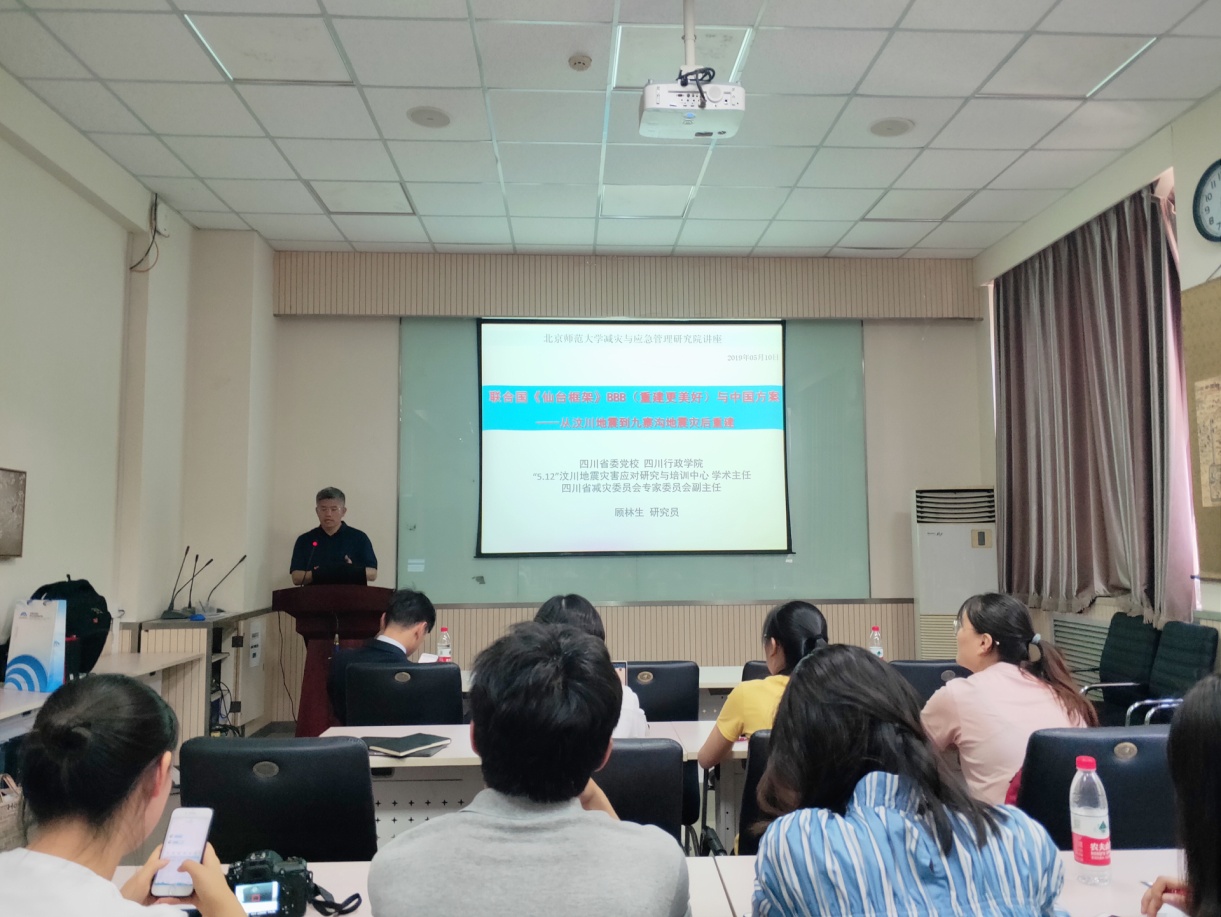2019510日上午,应减灾与应急管理研究院院长、环境演变与自然灾害教育部重点实验室主任张强教授邀请,四川省委党校“5.12”汶川地震灾害应对研究与培训中心学术主任、四川省减灾委员会专家委员会副主任顾林生研究员在生地楼148会议室作了题为“联合国《仙台框架》BBB与中国方案—从汶川地震到九寨沟地震灾后重建”的学术报告。张强教授主持了此次报告会并致欢迎词,减灾院叶涛副院长以及众多博士、硕士研究生参加了此次学术报告会。