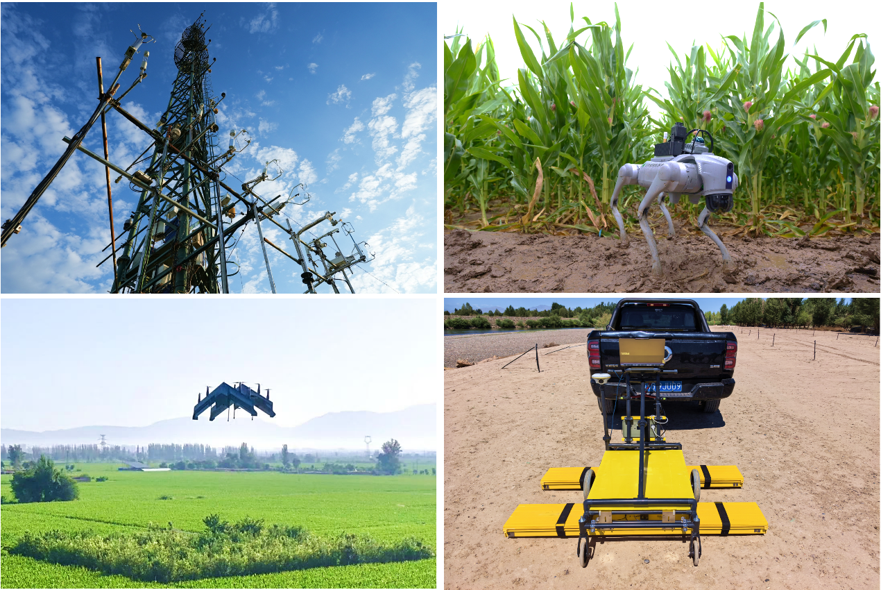 “黑河联合测试(EcoTest)”野外场景:研发的开路与闭路涡动相关系统(左上)、新型遥感无人机(左下)、生物观测智云犬(右上)、车载多频地下水位探测仪(右下)