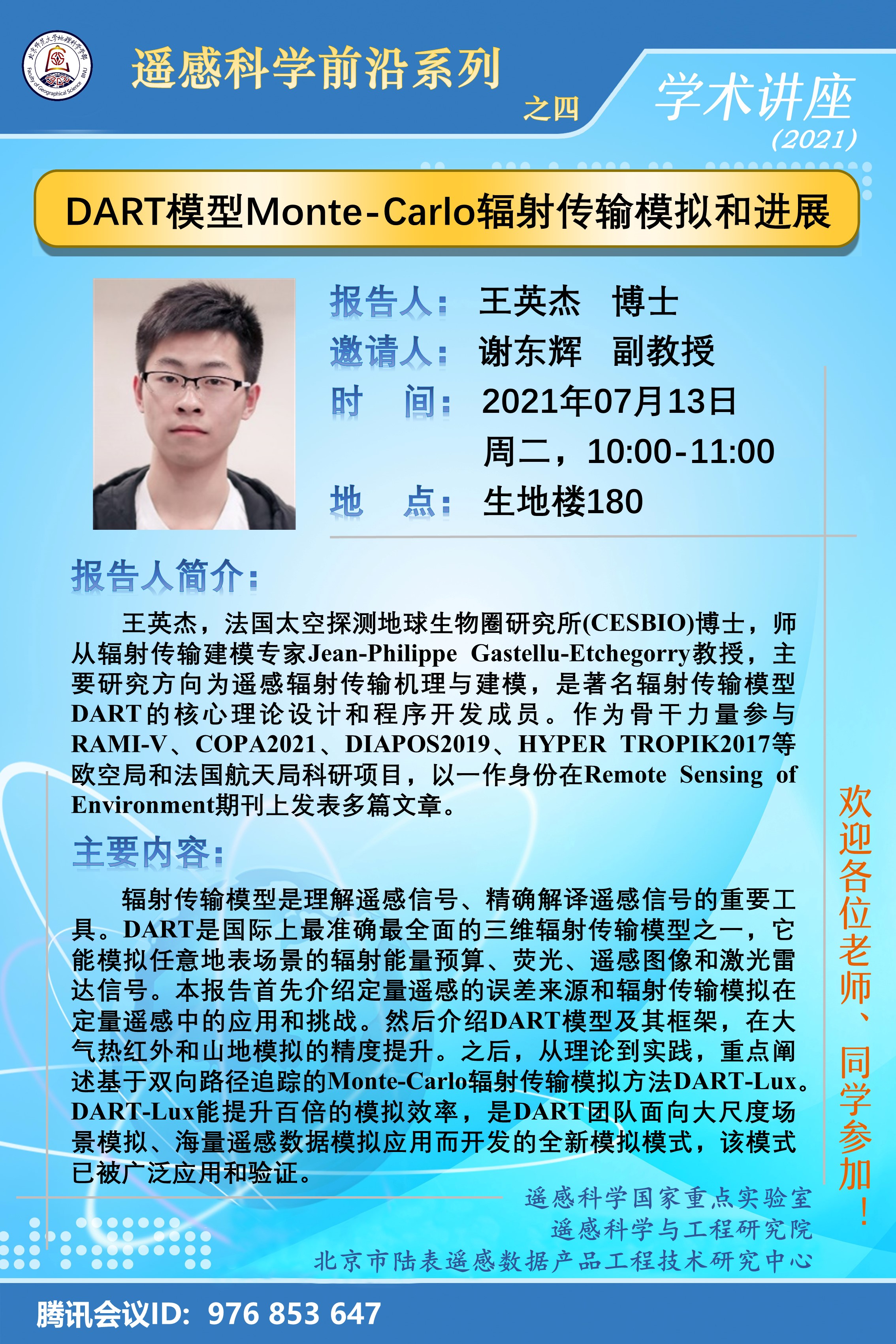 【7月13日讲座】遥感科学前沿讲座,王英杰,DART模型Monte-Carlo辐射传输模拟和进展