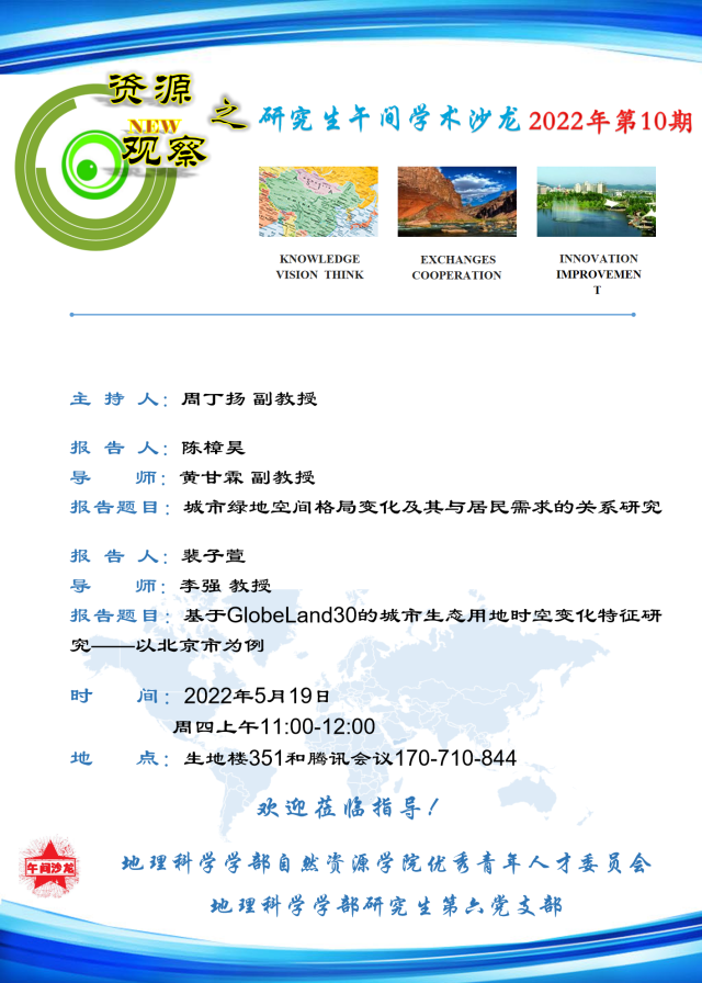 【5月19日研究生学术沙龙】陈樟昊:城市绿地空间格局变化及其居民需求的关系研究,裴子萱:基于Globeland30的城市生态用地时空变化特征研究——以北京市为例