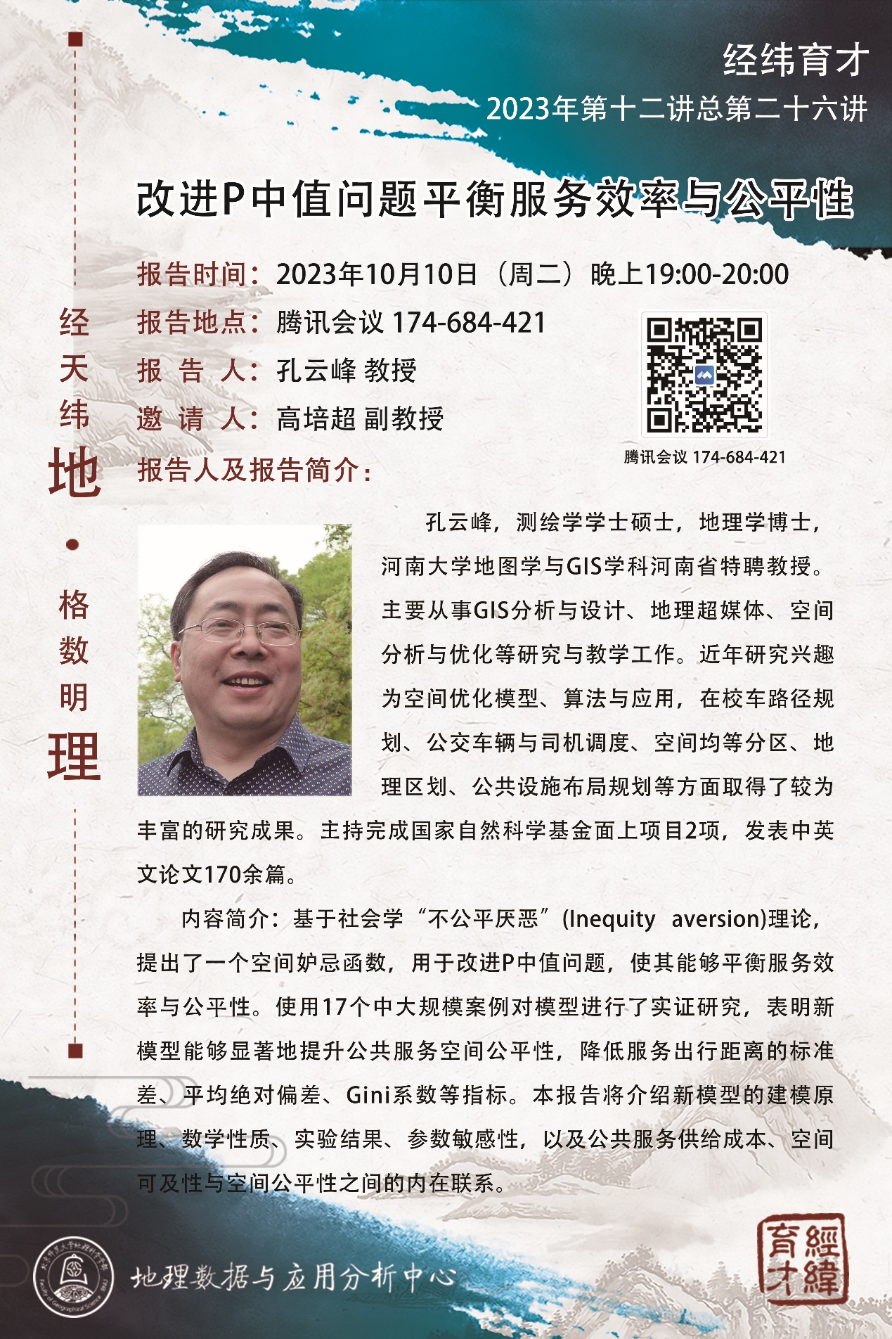 【10月10日】孔云峰 教授,改进P中值问题平衡服务效率与公平性